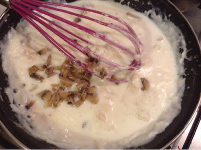 4. A la bechamel le añadimos la pechuga de pollo, los champiñones, la sal y la pimienta negra y vamos removiendo para que no se pegue.